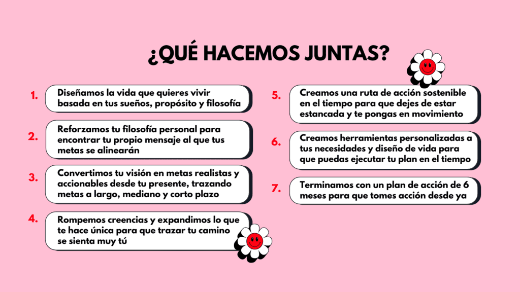 Empieza a crear y a vivir tu vida soñada desde hoy. Con mi metodología, diseñamos tu vida desde la visión, tu propósito, el estilo de vida que quieres vivir y creamos un plan con metas a largo, mediano y corto plazo accionable desde el primer momento.
